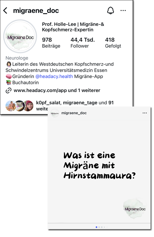 Eine der wenigen konstanten, medizinisch fundierten Stimmen ist der Instagram-Account der Neurologin und Kopfschmerzexpertin Prof. Dr. Dagny Holle-Lee (Leiterin des Westdeutschen Kopfschmerz- und Schwindelzentrums, Uniklinik Essen).
