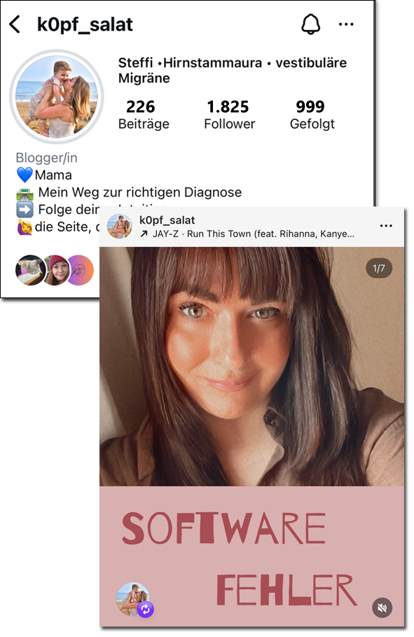 Steffi schreibt auf ihrem Account @k0pf_salat über Migräne mit Hirnstammaura und vestibuläre Migräne: Offen, nahbar und mit einem Blick darauf, wie sehr diese Erkrankungen den Alltag verändern können.